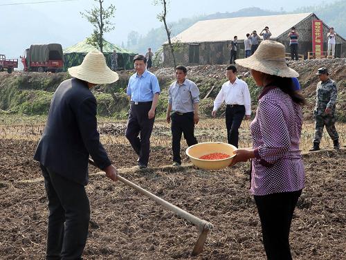 这是5月21日,习近平在芦山县龙门乡青龙场村的农田察看玉米种植情况,询问灾后恢复生产的安排。新华社记者 兰红光 摄